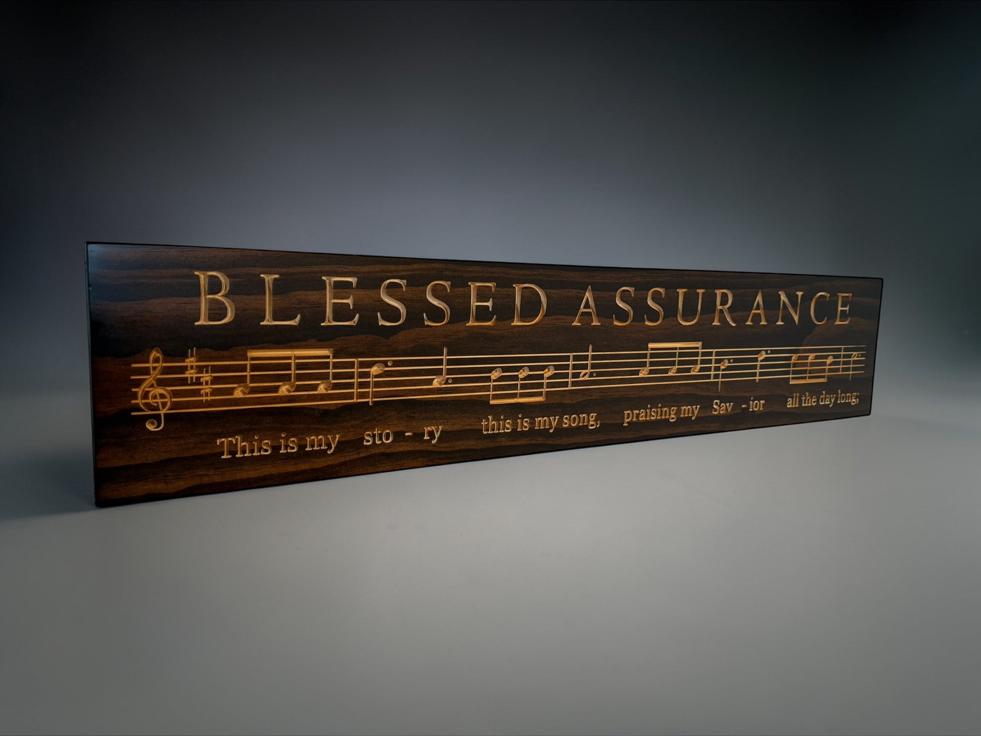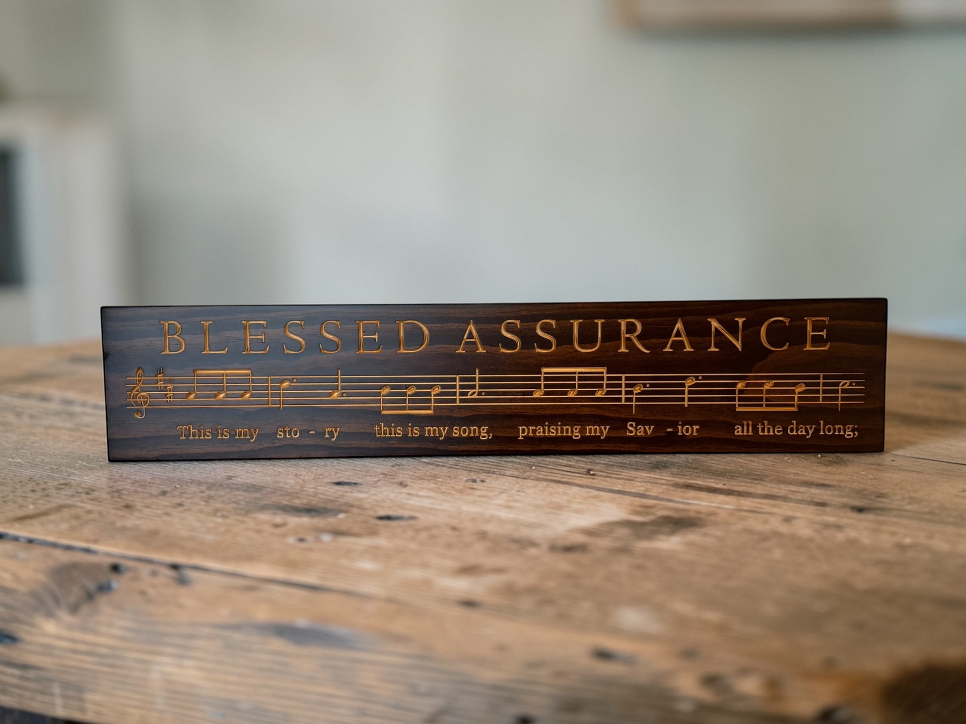 This Blessed Assurance Hymn sign features bold carved lettering paired with the opening lyrics flowing across a musical staff. It’s designed to feel timeless — a reminder of faith, comfort, and the moments that shape us.