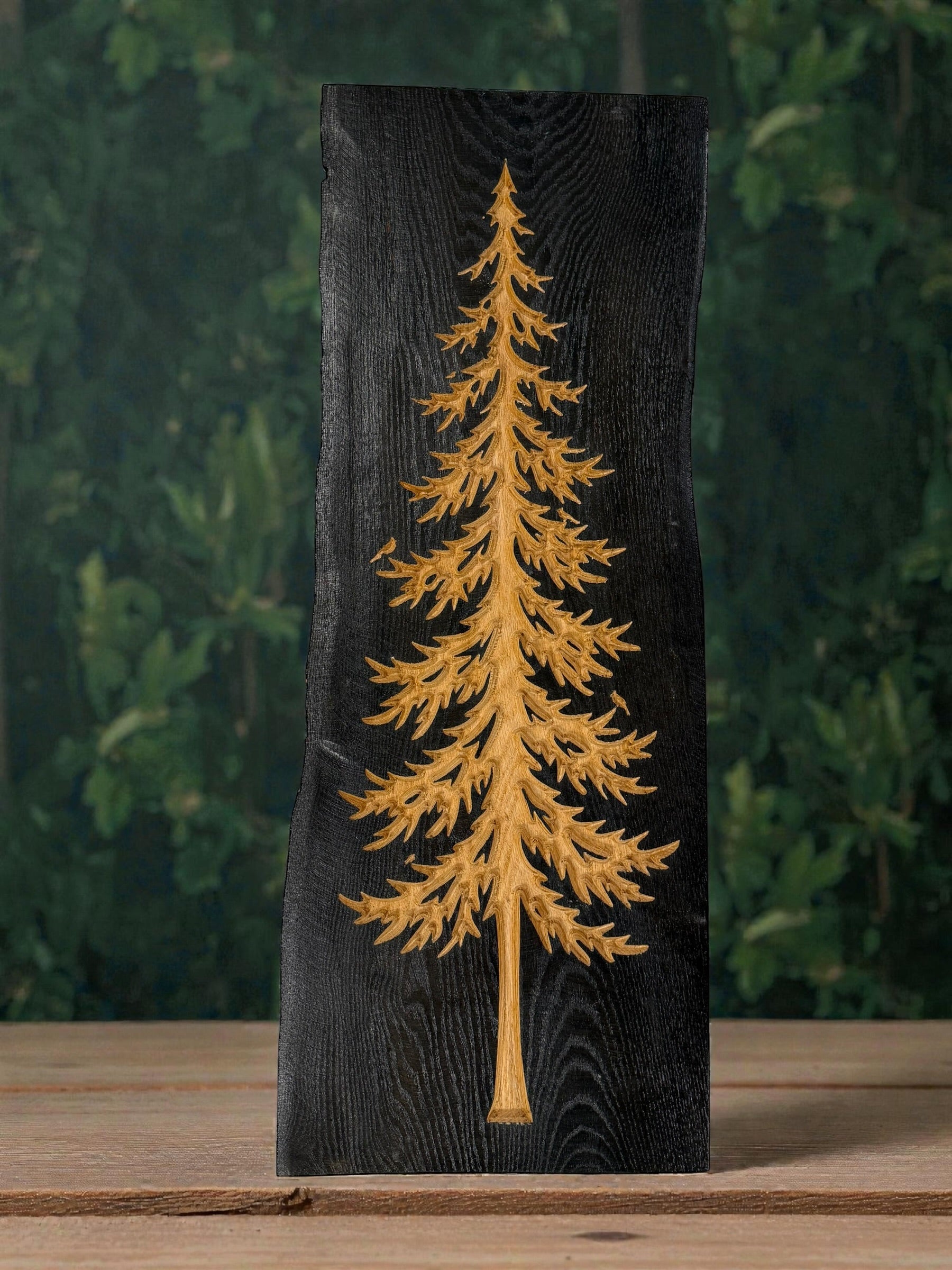Solid wood with dark stain and natural carved pine tree