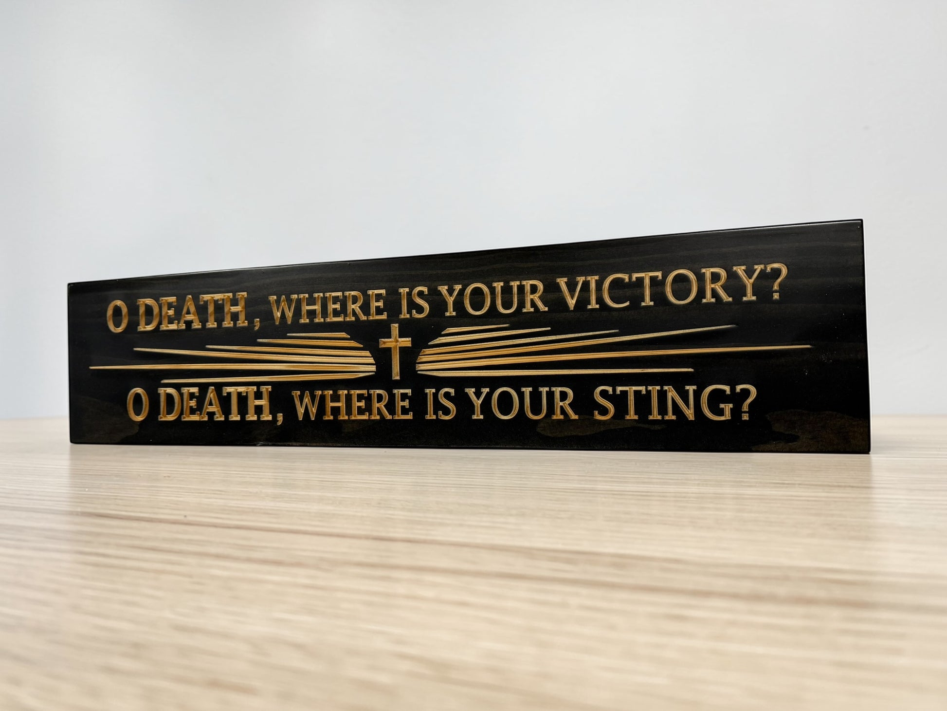 A simple carved cross sits centered between the lines, framed by clean, modern radiating accents — designed to feel timeless, not trendy.