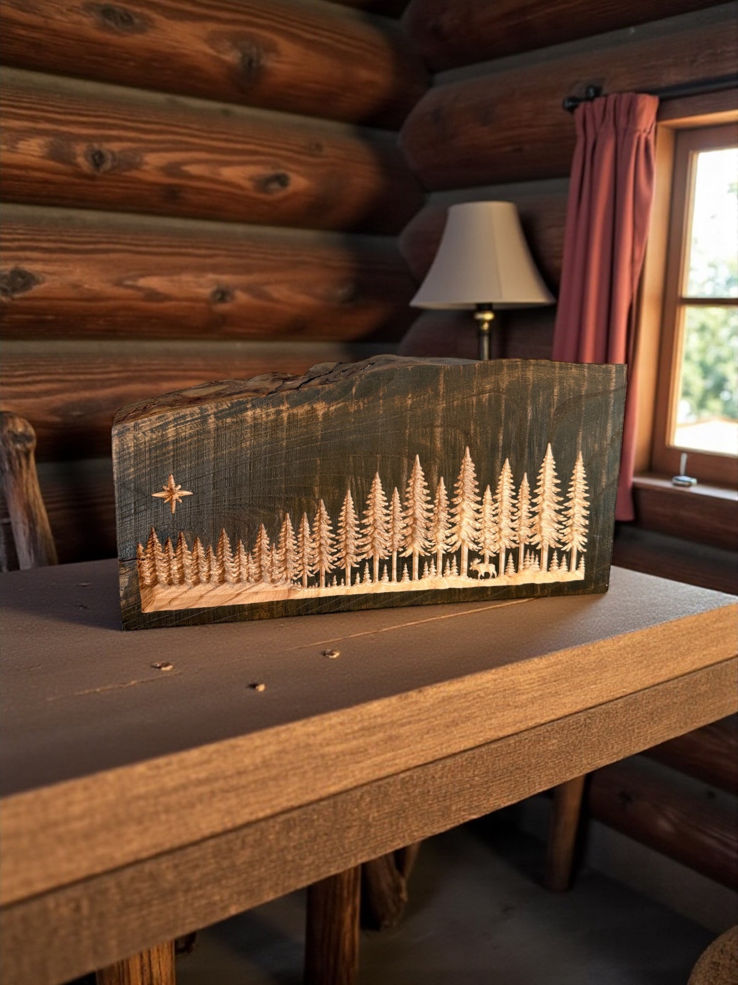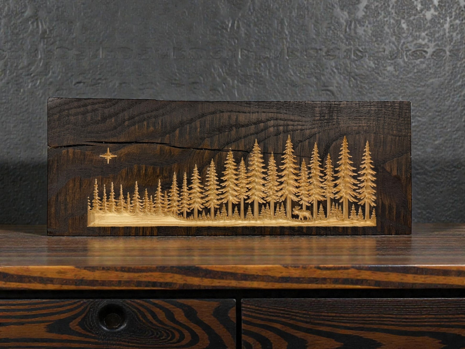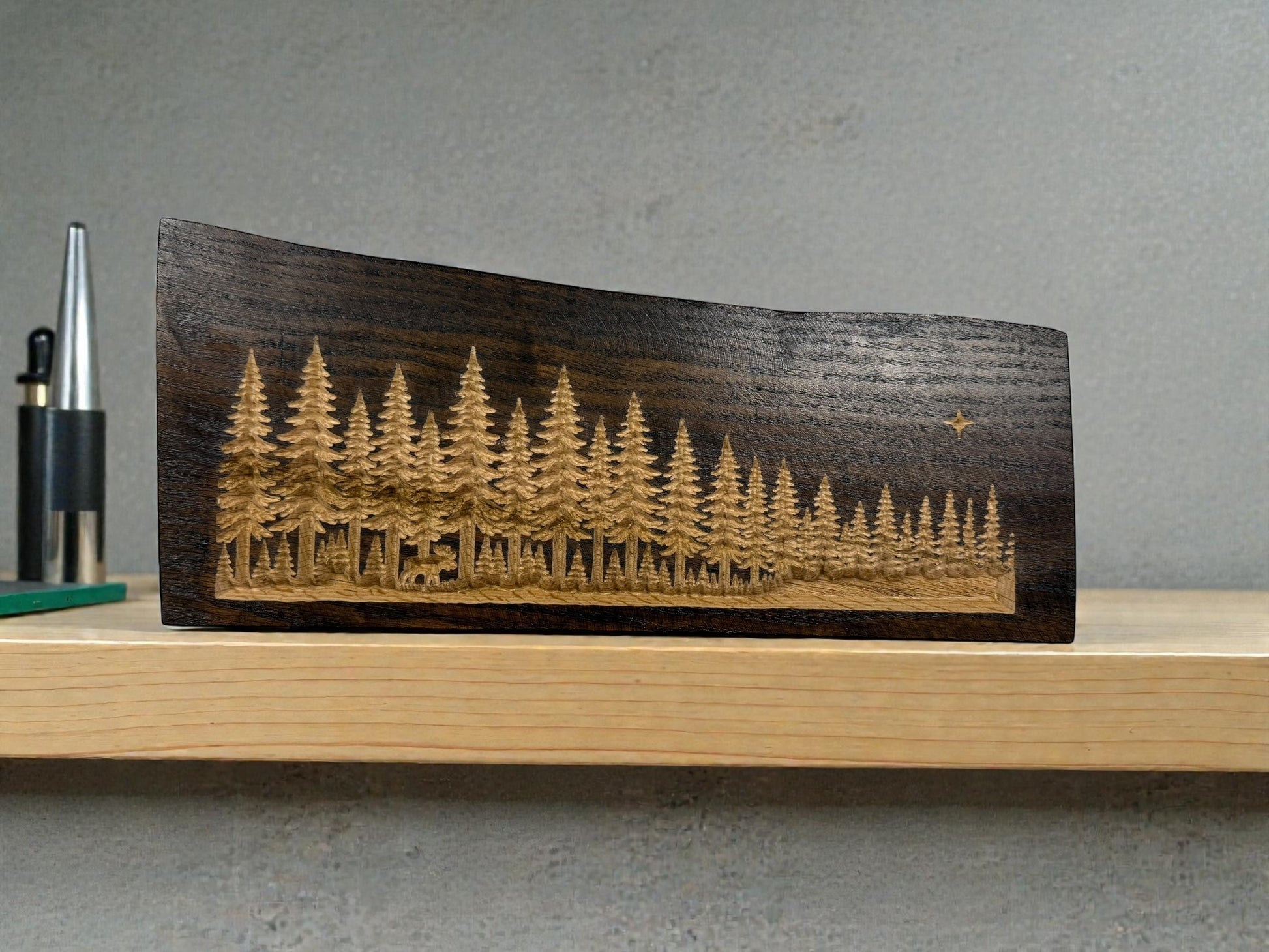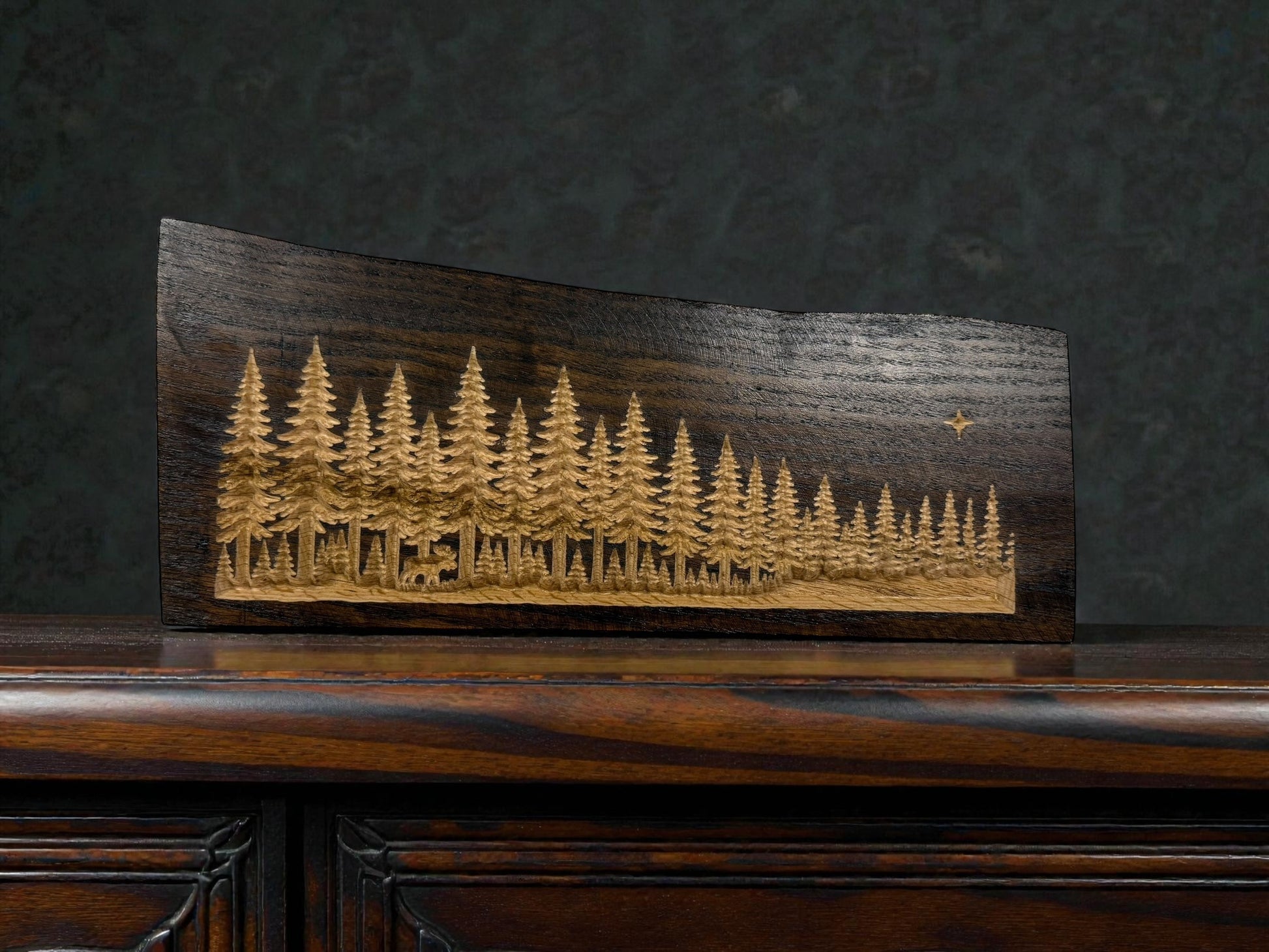Each piece is carved from solid wood and finished in a deep dark stain, revealing a hand-carved pine forest beneath. Tucked into the trees is a small moose, meant to be discovered rather than announced.